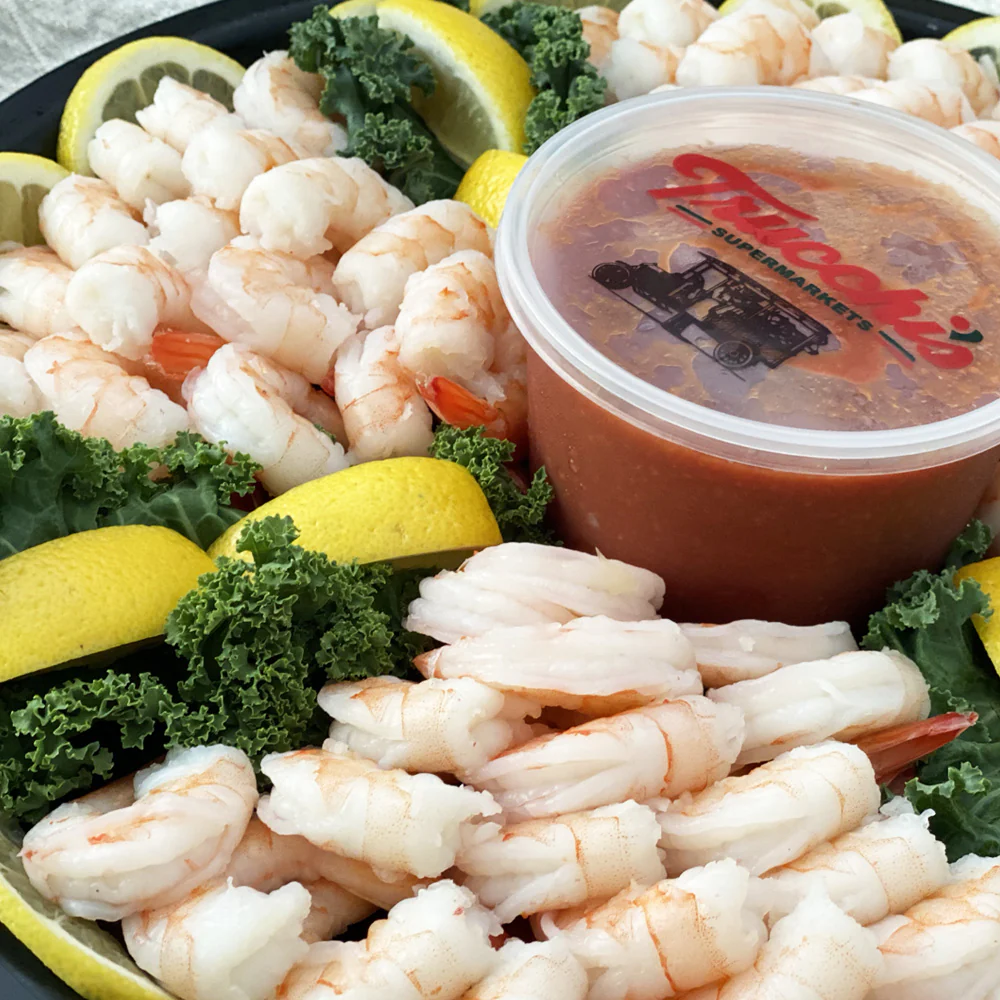 Deliciously cooked extra-large sized Cocktail Shrimp (26-30 per lb). We will beautifully arrange it with our zesty Cocktail Sauce and Lemon Garnish. Small serves 10-12; Large serves 25-30. Ā *Due to limited Shrimp supply, all shrimp platters are priced at current market prices. Prices are subject to change. |